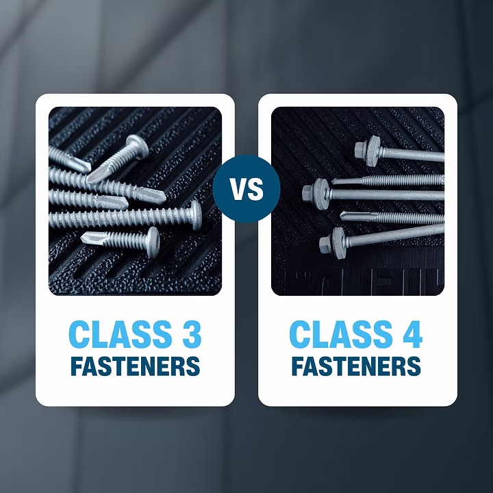 Class 3 and Class 4 roofing fasteners refer to corrosion performance standards tested in accordance with SANS 1273 and aligned to ISO 9223 corrosion category environments. These classifications indicate the level of corrosion resistance a fastener provides, with higher classes offering increased protection in more demanding conditions.